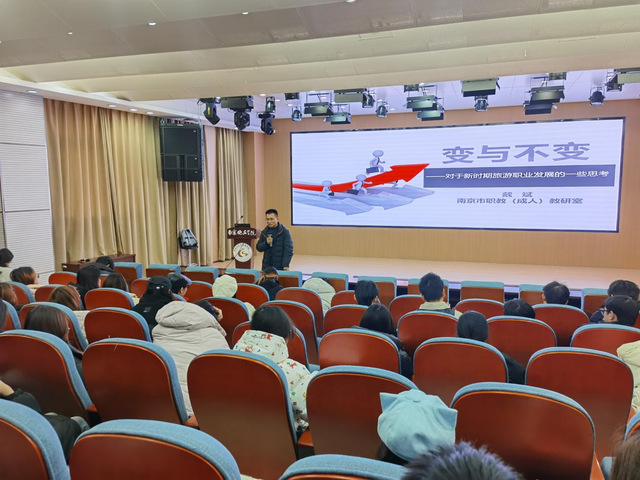 On the afternoon of January 3rd, the School of Tourism and Social Management held a professional exchange meeting on tourism management in the Wenbei 200 Hall, inviting Dai Bin, an outstanding alumnus, the senior lecturer of Nanjing Vocational Education (Adult) Teaching and Research Office, and Secretary General of Nanjing Cultural and Tourism Vocational Education (Group) Working Committee, to return to the School for exchange.